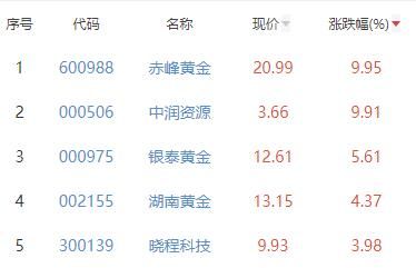 其中,赤峰黄金、中润资源、银泰黄金、湖南黄金、晓程科技位列板块涨幅前五位,涨幅分别为9.95%、9.91%、5.61%、4.37%、3.98%。