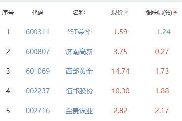 *ST荣华、济南高新、西部黄金、恒邦股份、金贵银业位列涨幅榜后五位,涨幅分别为-1.24%、0.27%、1.73%、1.88%、2.17%。